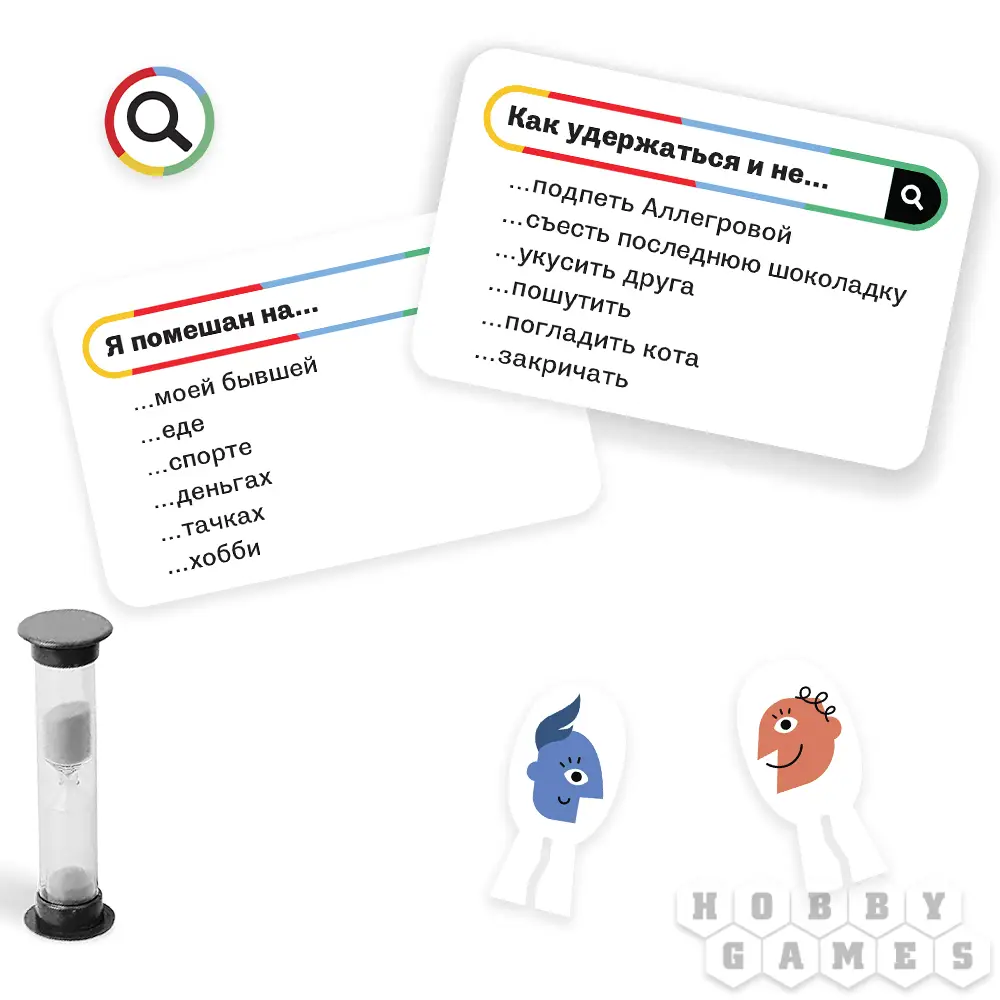 Вы только что узнали, как выглядит структура всех карт в игре – это начало запроса и несколько вариантов продолжения, которые может предложить вам поисковик. Перемешайте карты запросов, разместите красный и синий жетоны команд на ячейках "Старт", случайным образом определите ведущего, а остальных игроков поделите на 2 команды. Вы готовы к игре! Ведущий берёт одну карту, зачитывает начало запроса и переворачивает песочные часы. Обратный отсчёт пошёл! За 40 секунд команды должны назвать как можно больше правильных вариантов поисковых запросов, которые указаны на карте ведущего. Если последний услышал близкий ответ к одному из вариантов, то берёт жетон правильного ответа и кладёт перед игроком, назвавшим его. Больше за этот ответ жетон получить нельзя. Раунд заканчивается вместе с последней песчинкой упавшей на дно часов. Или когда все варианты с карты ведущего будут названы. Теперь команды считают количество заработанных жетонов – на их количество жетоны команд продвигаются по треку победных очков.