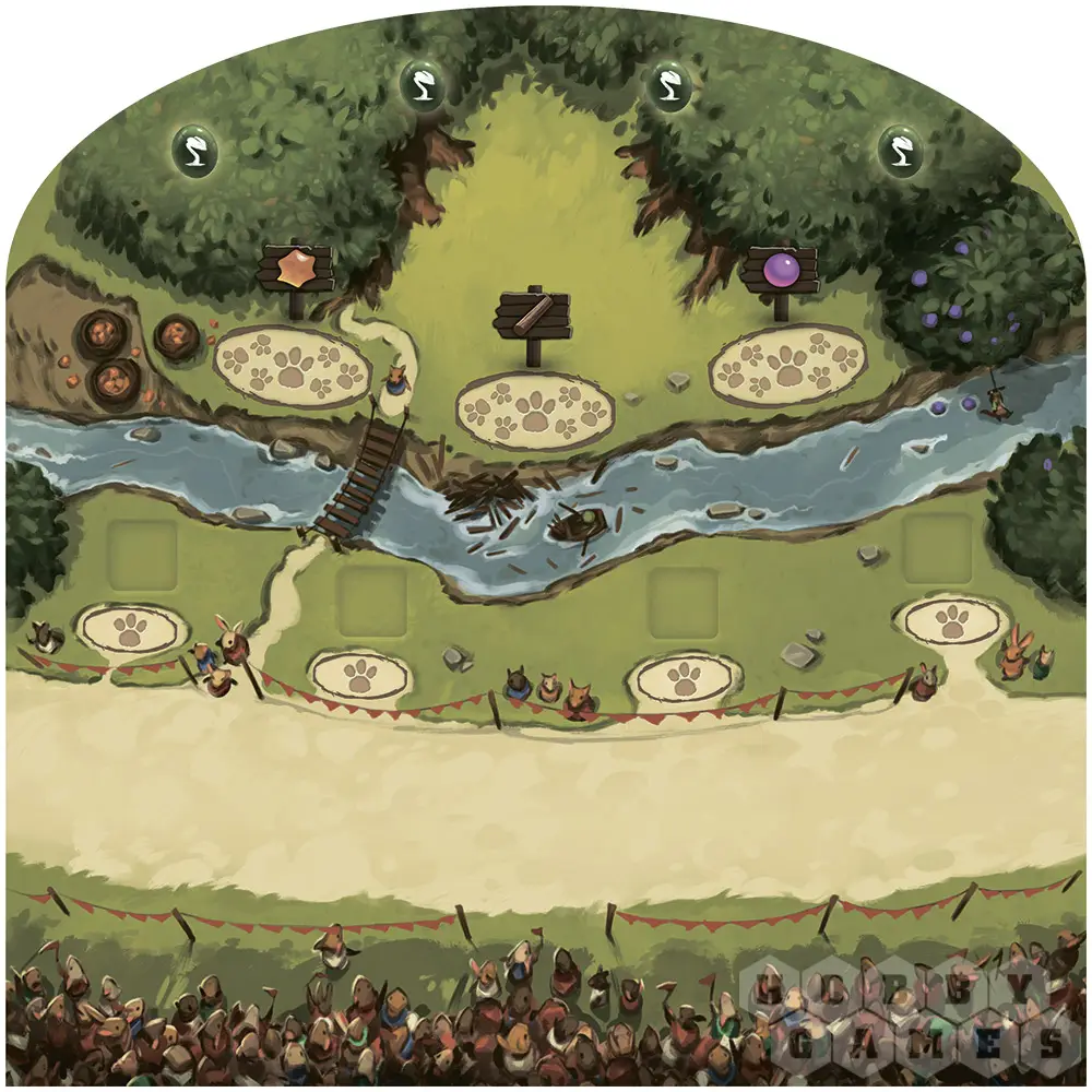 Вначале раунда первый игрок бросает 4 кубика ресурсов и помещает их в ячейки на поле. Сразу после этого игроки приступают к сбору урожая, применяя эффекты своих ранее разыгранных зелёных карт. А когда урожай будет собран, можно и действия повыполнять: игроки по очереди отправляют свои фишки друзей на ячейки игрового поля, выполняя соответствующие им действия. После размещения фишки можно сыграть одну карту с поляны, оплатив её стоимость ресурсами из запаса.