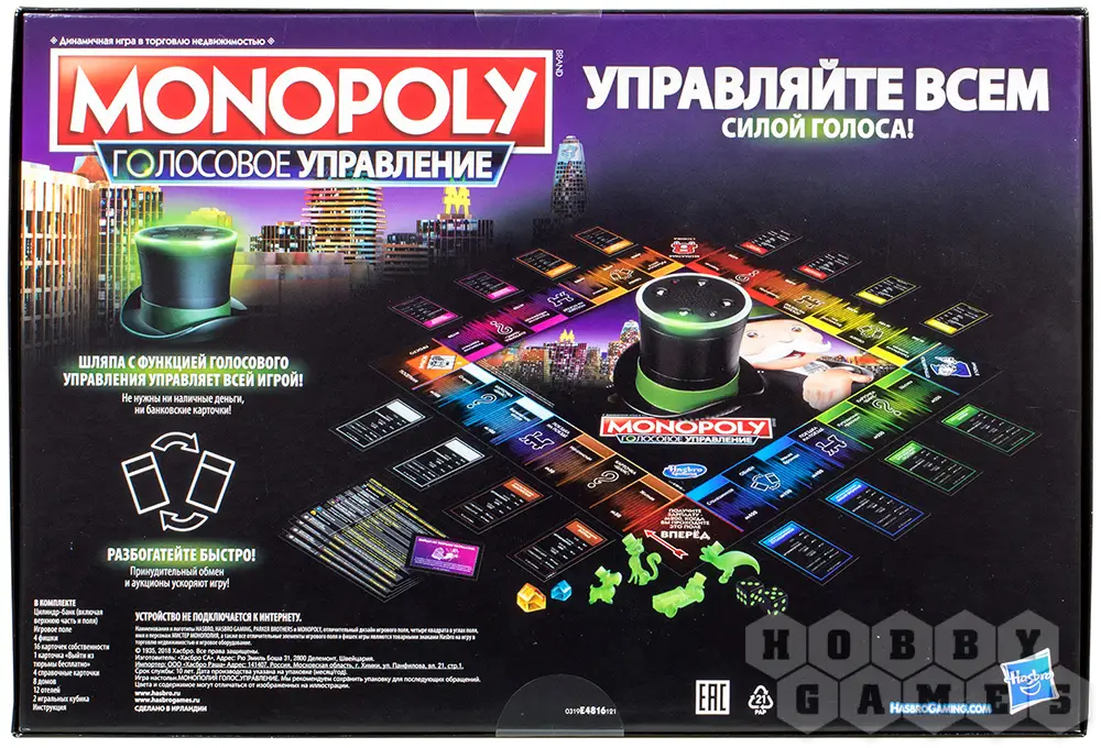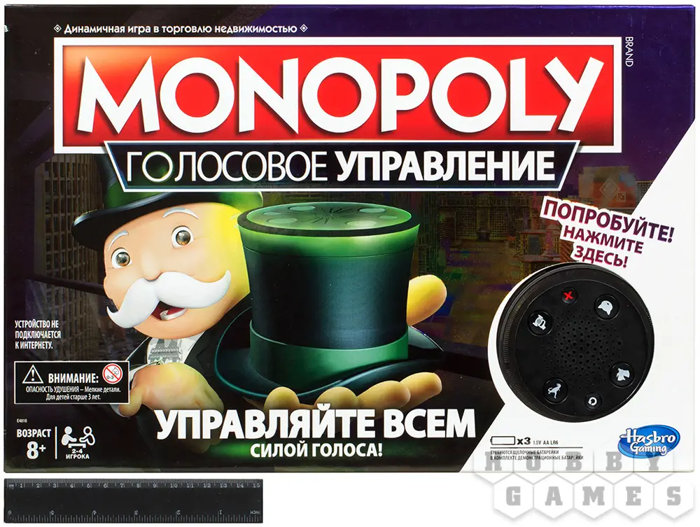 Монополия – одна из самых знаменитых игр! Несмотря на свою многолетнюю историю, игра продолжает удивлять поклонников неожиданными сюрпризами и механиками. Если вы знаете имена Алиса и Siri, то вы сразу поймёте о чём "Монополия. Голосовое управление". Умный помощник из игры не сможет настроить освещение в игровой комнате, зато он будет вести учёт игровых средств – вам не придётся теребить в руках честно "намонополизированные". А ещё шляпа мистера Монополии с железной логикой машины будет следить за тем, чтобы все играли по правилам (если жёсткие правила вам не по вкусу, обратите внимание на игру "Монополия. Большая Афера").