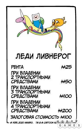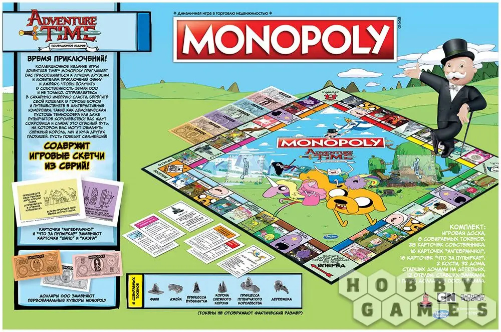 Коллекционное издание монополии по вселенной Adventure Time™ приглашает вас присоединиться к Джейку и Финну, лучшим друзьям и любителям приключений, чтобы получить в собственность Земли Ооо. Вас ждут сокровища, слава и фирменный юмор мультсериала "Время приключений".