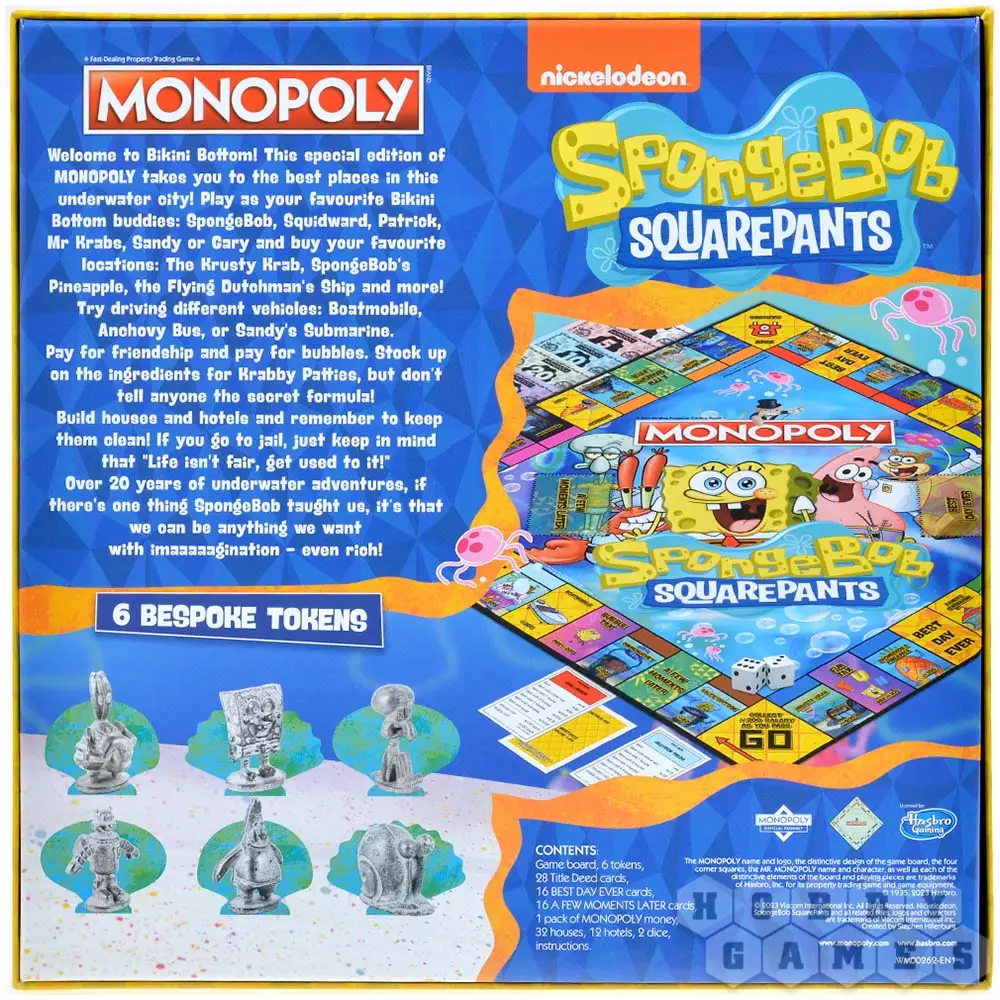 Знаменитая игра "Монополия" вдохновилась безумным мультсериалом "Губка Боб Квадратные Штаны". В этом наборе вы найдёте несколько жетонов с вашими любимыми персонажами: от беззаботного Губки Боба до непокорного Сквидварда, от весёлого Патрика до амбициозной Сэнди. Начинайте игру и покупайте любимые локации: домик Губки Боба или Патрика, захудалый ресторанчик Планктона или может вам повезёт завладеть самим "Красти Крабом"!