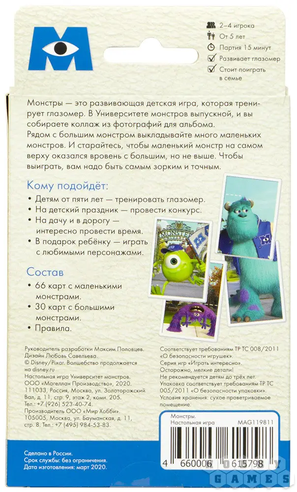Настольная игра "Монстры" прекрасно подойдёт в качестве подарка ребёнку, а также любому любителю легендарного мультфильма "Корпорация монстров".