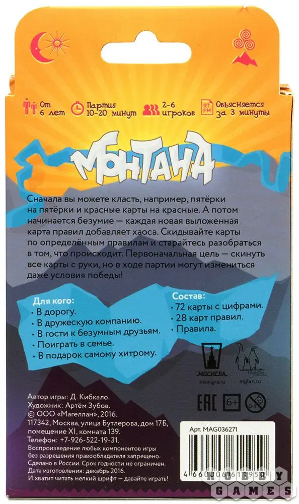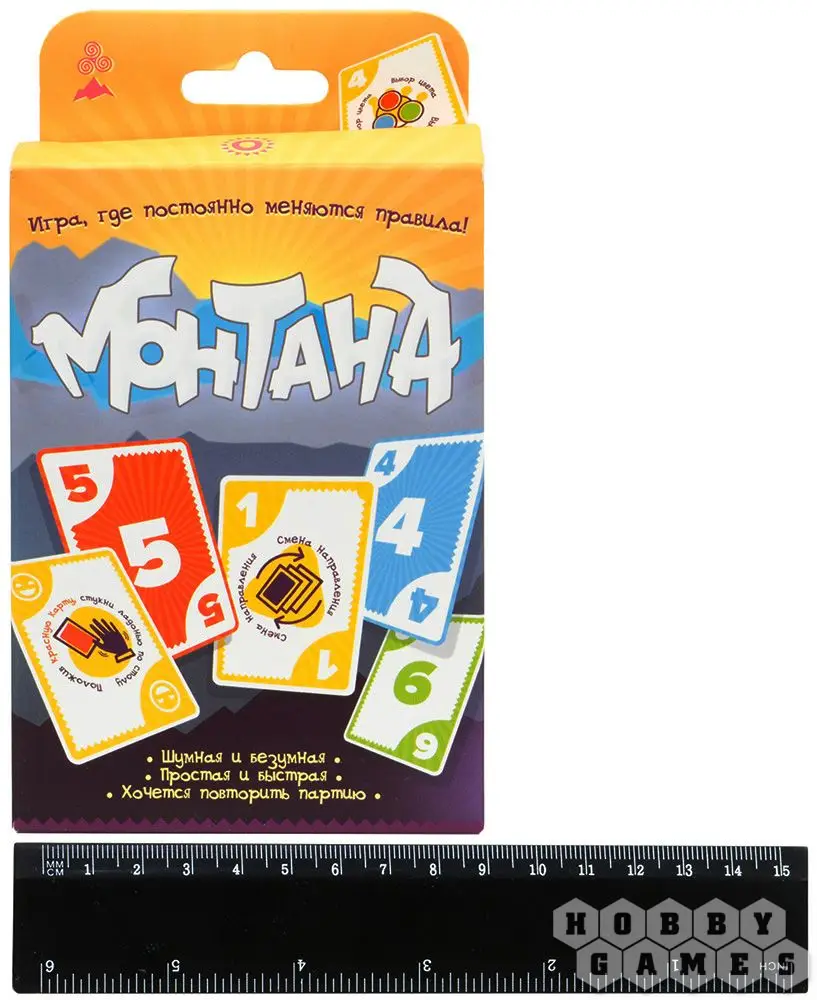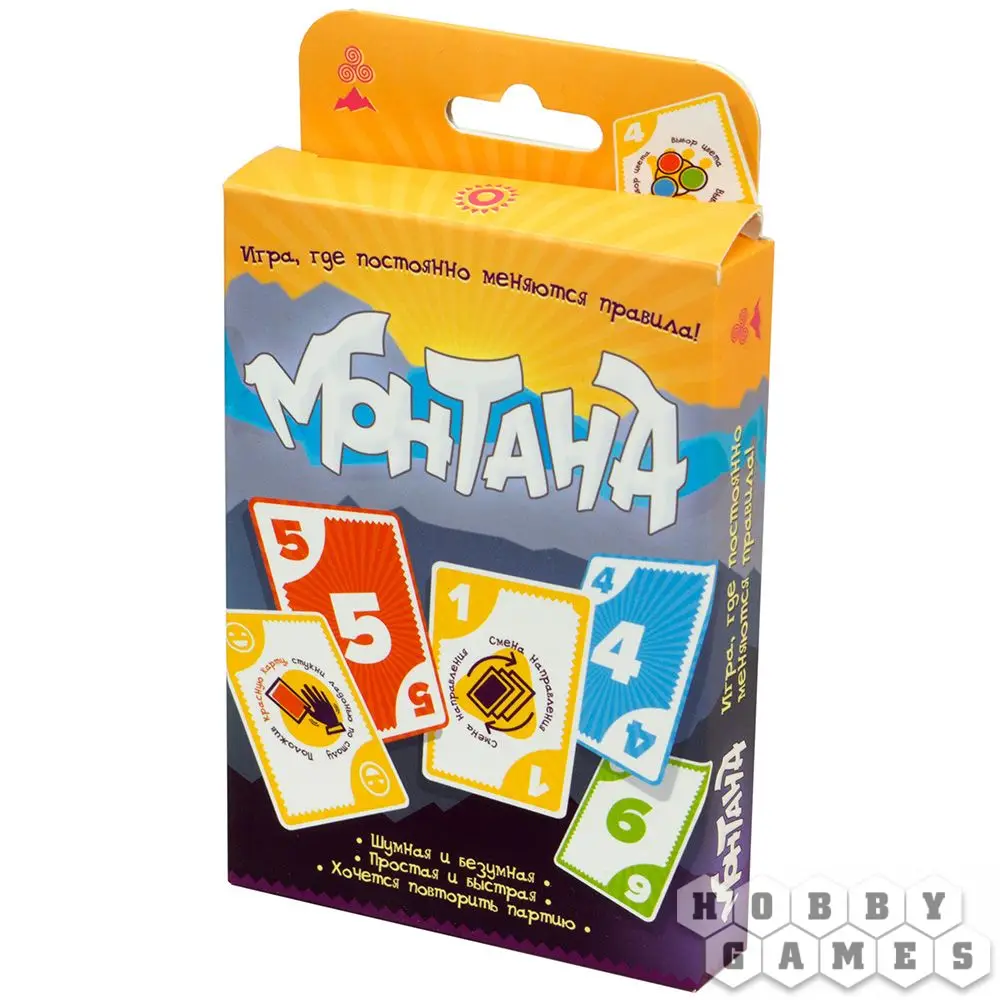 "Монтана" – это очень необычная настольная карточная игра, основной фишкой которой является колода правил, каждый ход меняющая правила игры. Основная колода в игре состоит из карт с цифрами, они бывают: трёх цветов (красные, синие и зелёные), с пустым и закрашенным фоном, а также номиналом от одного до шести. Эти показатели очень важны и именно на них влияют постоянно переменяющиеся правила.