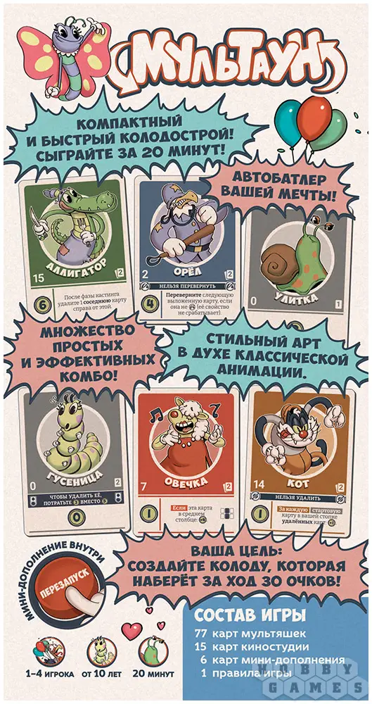 Компактный и быстрый колодострой, который работает как автобатлер мечты! Вместо долгих часов изучения механик вас ждут молниеносные партии: цель прозрачна и амбициозна – набрать тридцать очков за один ход. Соберите команду из озорных мультяшек, добавьте карты киностудии, чтобы усилить эффект, и запустите комбо-машину! Множество простых и, главное, эффективных сочетаний превратят ваш ход в каскад взрывных спецэффектов. Визуально игра радует стильным артом в духе классической анимации – каждый персонаж дышит харизмой и готов влюбить в себя с первого взгляда.