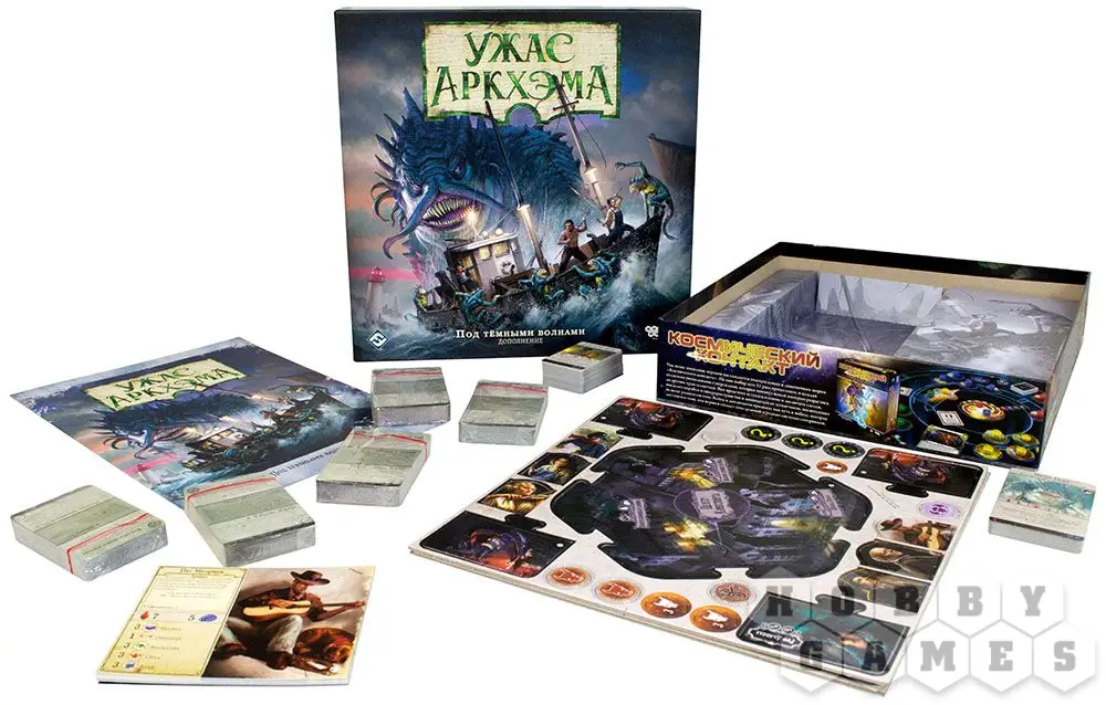 "Под тёмными волнами" – масштабное дополнение для настольной игры "Ужас Аркхэма", которое содержит в себе 4 полноценных сценария с детальными и разветвлёнными сюжетами, повествующих о мрачный ужасах из глубины морей. В игре появятся персонажи с уникальными способностями, новое снаряжение и особые монстры. Помимо массы новых компонентов дополнение привносит новые механики, которые добавляют чудовищам необычные умения, распространяют по городу безысходность и позволяют игрокам выбирать игровые режимы, влияющие на сложность игры любого сценария.