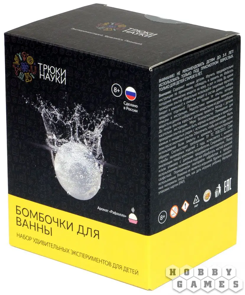 С набором “Трюки Науки - Бомбочки для ванны (рафаэлло)” ребенок сможет провести несложный и наглядный опыт по созданию соляной бомбочки для ванны. В результате получится плотный пестрый шар. При погружении в воду он будет слегка шипеть и создавать клубы пушистой пены, а воздух наполнится ароматом конфет Raffaello. Юные учёные будут в восторге! Дети очень любят принимать ванну с игрушками и пеной, тем более с той, что сделали самостоятельно!