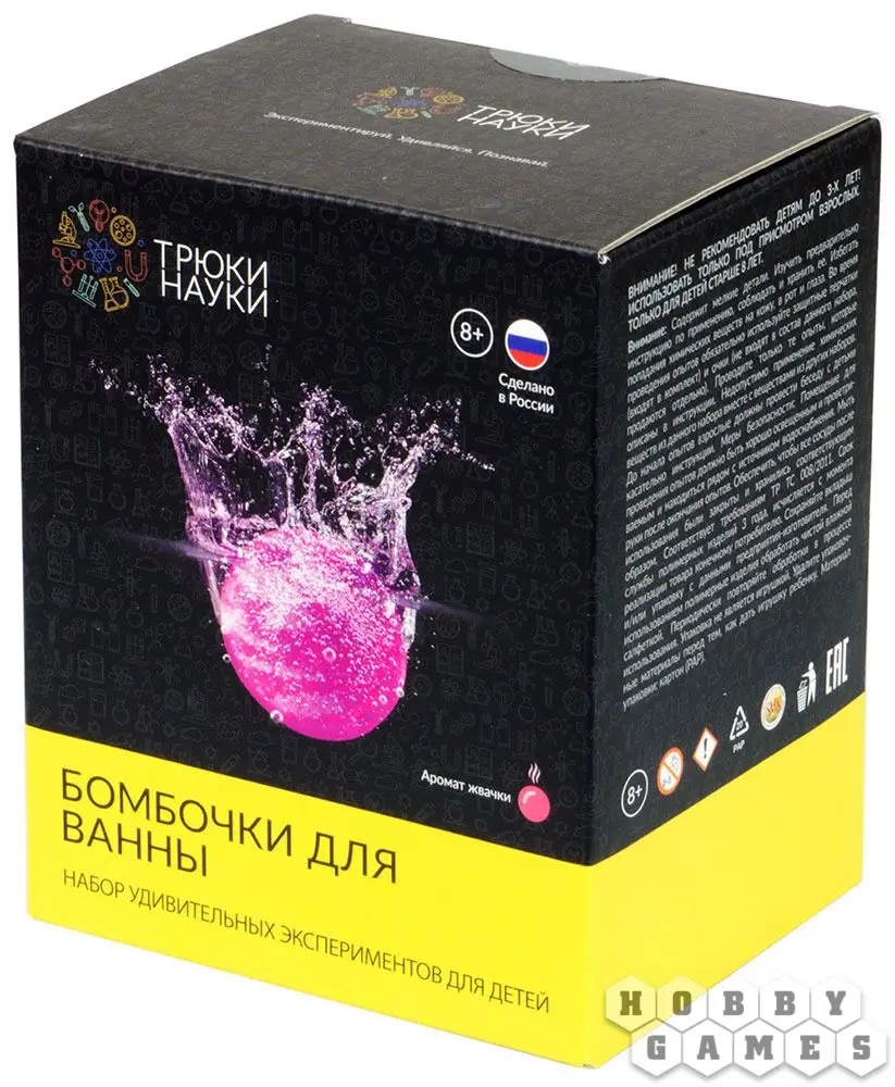 С набором “Трюки Науки - Бомбочки для ванны (жвачка)” ребенок сможет провести несложный и наглядный опыт по созданию соляной бомбочки для ванны. В результате получится плотный пестрый шар. При погружении в воду он будет слегка шипеть и создавать клубы пушистой пены, а воздух наполнится ароматом bubblegum. Юные учёные будут в восторге! Дети очень любят принимать ванну с игрушками и пеной, тем более с той, что сделали самостоятельно!