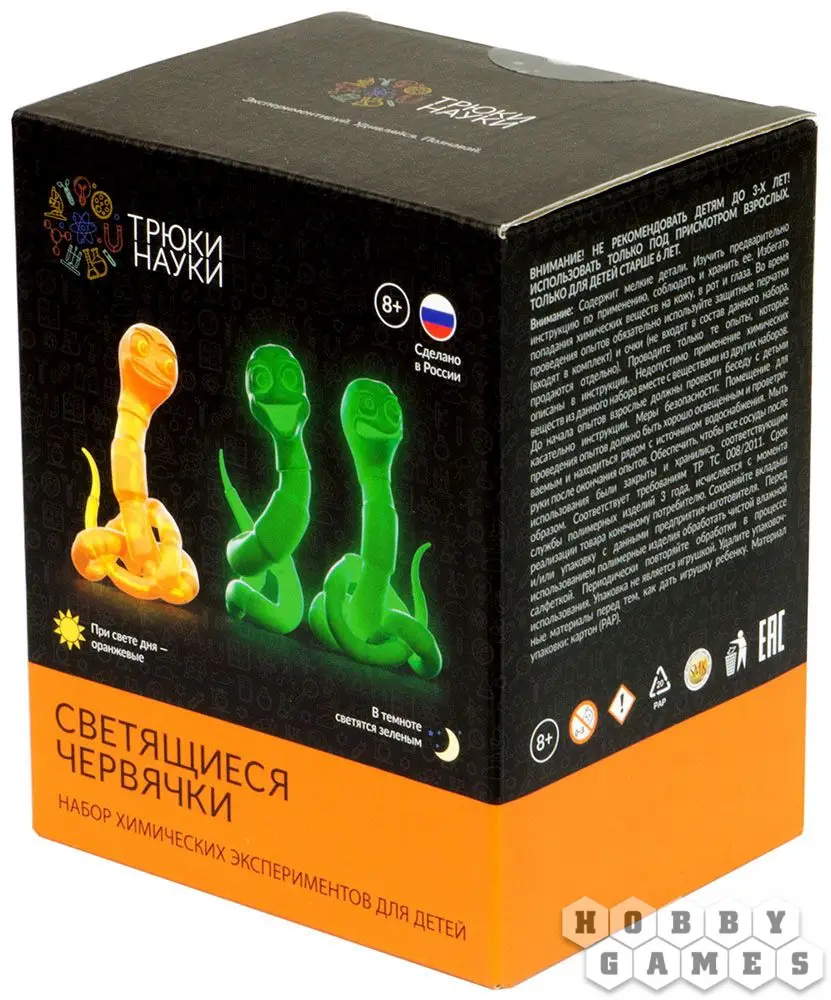 "Трюки науки" продолжают удивлять детей и взрослых забавными фокусами. В этой коробке, экспериментаторы найдут необходимые реагенты, чтобы создать необыкновенных червячков. Они будут изменять свой цвет в зависимости от освещения: при ярком свете они оранжевого цвета, а в темноте червячки подсвечиваются зелёным. Простой и увлекательный опыт позволит ребенку расширить кругозор и увидеть, что наука — это весело и интересно. Несложный опыт сможет научить юного учёного аккуратности, внимательности и усидчивости.