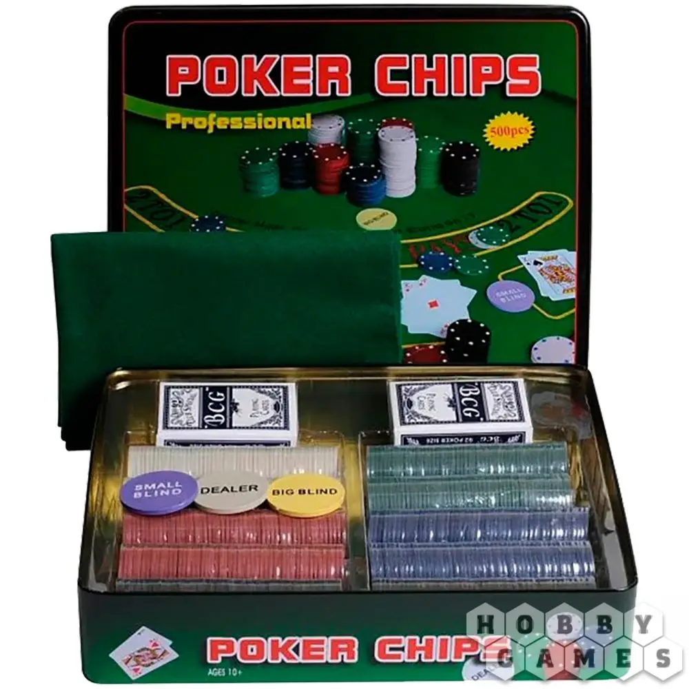 В данном комплекте вы найдёте всё необходимое для игры в классический покер. Внутри вы найдёте 500 стандартных фишек для профессиональной игры (11,5 гр.), фишку дилера, 2 колоды игральных карт, соответствующих качеству карт казино, а также сукно на стол.