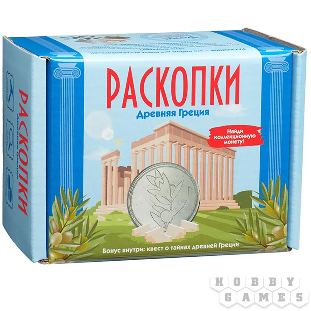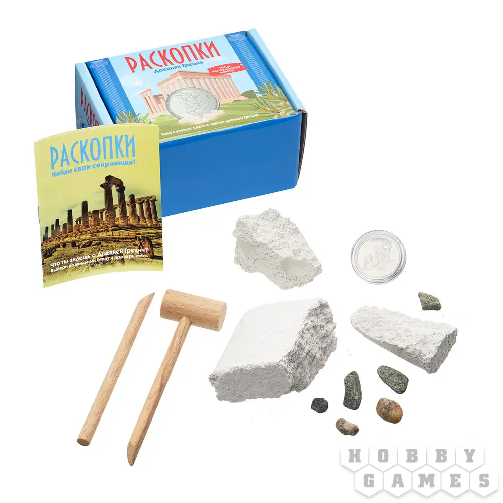 Приготовьтесь ощутить себя в роли самого настоящего археолога! Увлекательные раскопки и поиск сокровищ теперь могут с лёгкостью оказаться на вашем столе. Древние артефакты и доисторические драгоценности заключены внутри бруска из окаменелого грунта. В наборе "Древняя Греция" в грунте спрятана настоящая коллекционная монета племени и брошюра с мини-викториной.