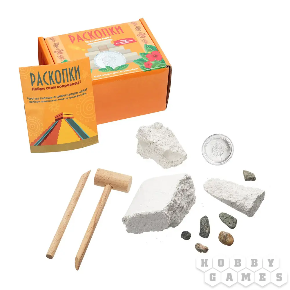 Приготовьтесь ощутить себя в роли самого настоящего археолога! Увлекательные раскопки и поиск сокровищ теперь могут с лёгкостью оказаться на вашем столе. Древние артефакты и доисторические драгоценности заключены внутри бруска из окаменелого грунта. В наборе "Племена Майя" в грунте спрятана настоящая коллекционная монета племени и брошюра с мини-викториной.
