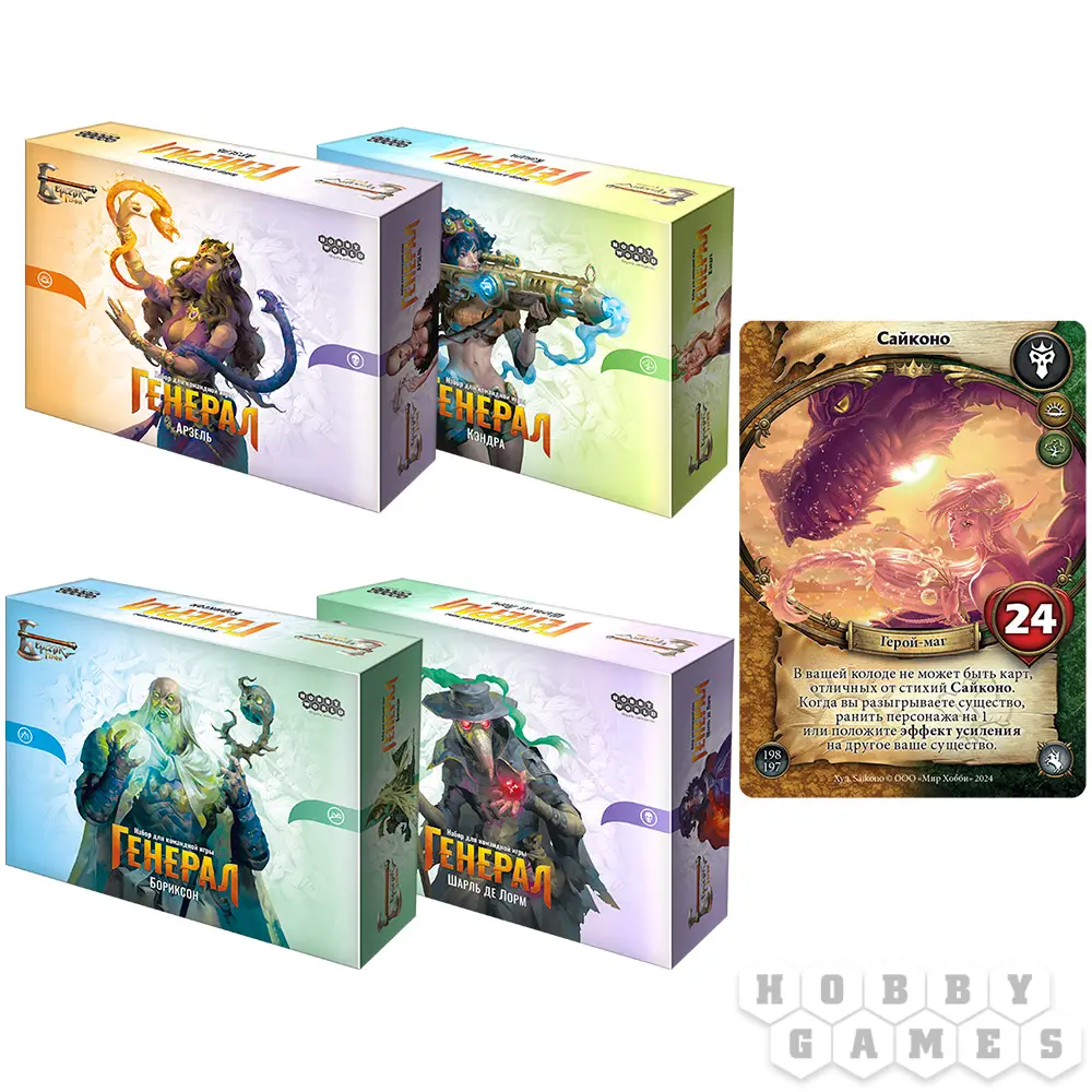 В этом наборе вас ждут: "Берсерк. Герои. Генерал: Арзель", "Берсерк. Герои. Генерал: Бориксон", "Берсерк. Герои. Генерал: Кэндра", "Берсерк. Герои. Генерал: Шарль де Лорм" и редкая фойловая карта "Сайконо". Иначе говоря, 5 источников серотонина и дофамина, знакомых каждому игроку, который хоть раз покупал какую-нибудь новенькую настолку.