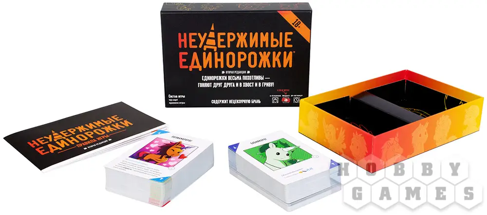 "Неудержимые единорожки" – это весёлая карточная игра, которая украсит собой любую вечеринку. И ещё бы, ведь рецепт этой настолки невероятно прост и изыскан: милые единороги и поразительные разрушения! Данное издание изобилует смелыми, откровенными, а порой и непотребными иллюстрациями и шутками и предназначено только для взрослой и, желательно, морально закалённой аудитории!