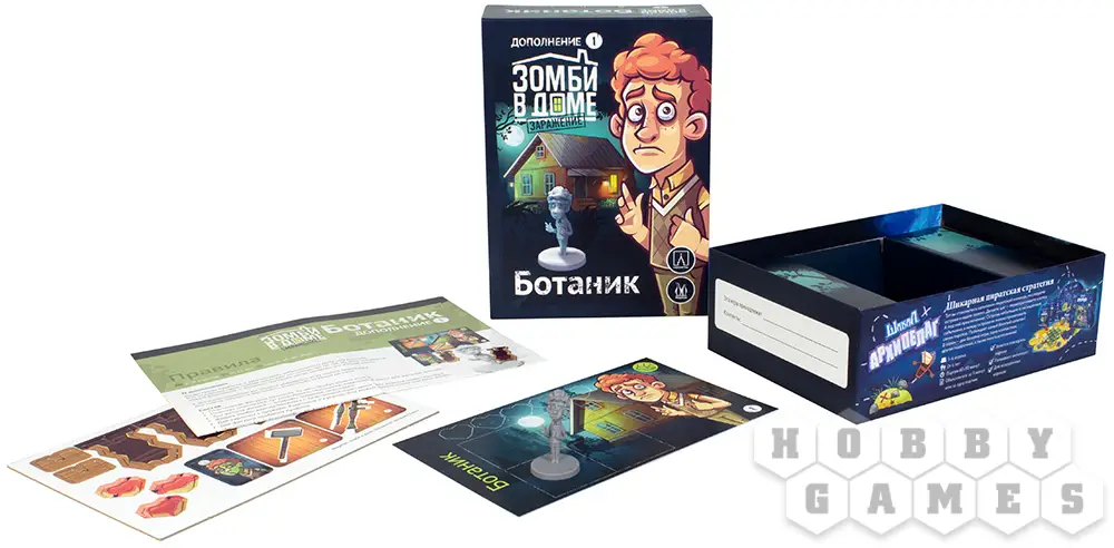 Дополнение к базовой игре "Зомби в доме. Заражение". С ним вы сможете играть впятером – с персонажем-ботаником и двумя новыми видами оружия. Преимущество этого героя – скорость. Сколько бы не выпало ходов на вертушке, ботаник ходит больше на шаг. Присоединяйтесь к остальным героям – шансы выжить во время зомби-апокалипсиса повышаются, если действовать сообща.