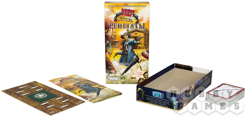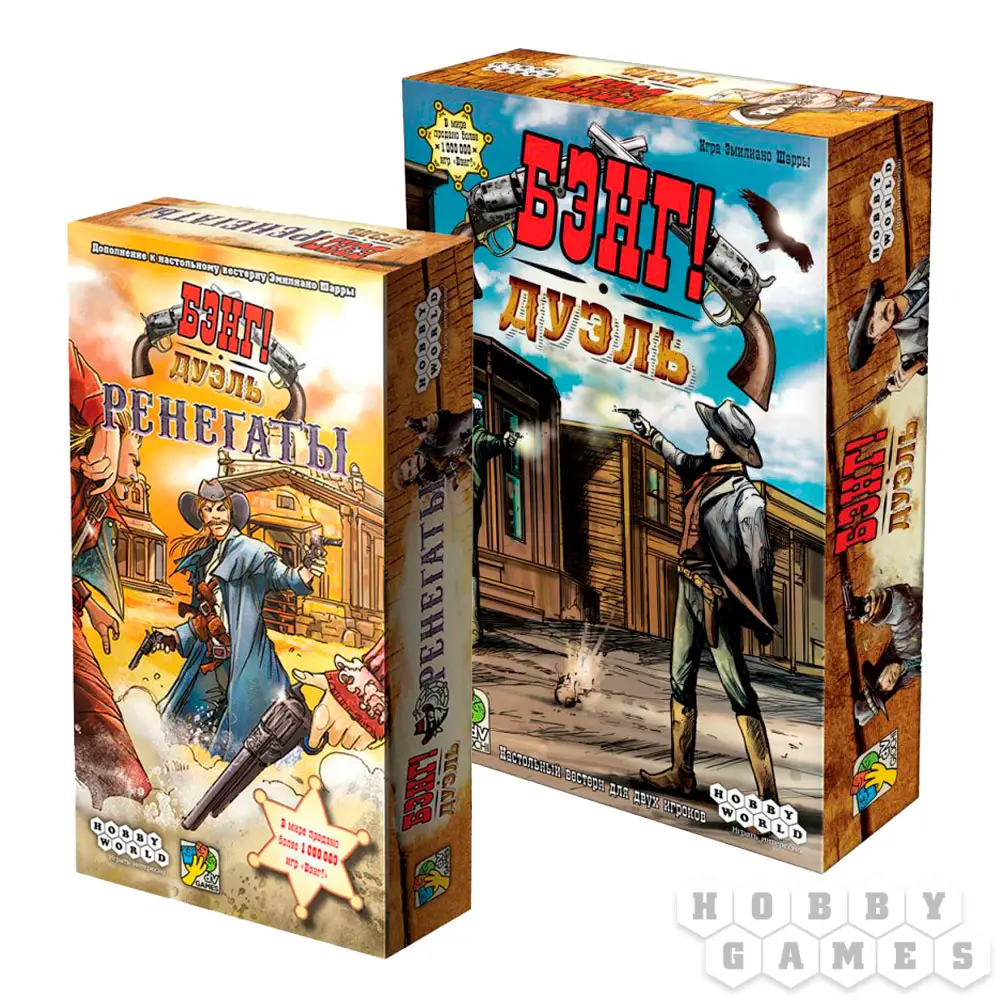 Набор включает в себя игру "Бэнг! Дуэль" и дополнение "Бэнг! Дуэль: Ренегаты" со скидкой 10%.