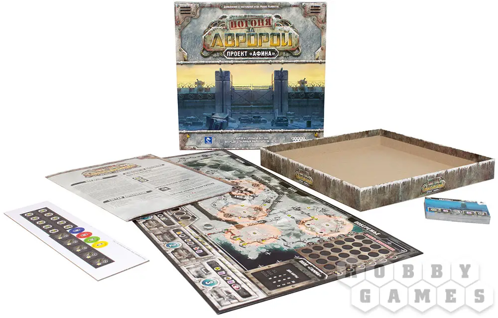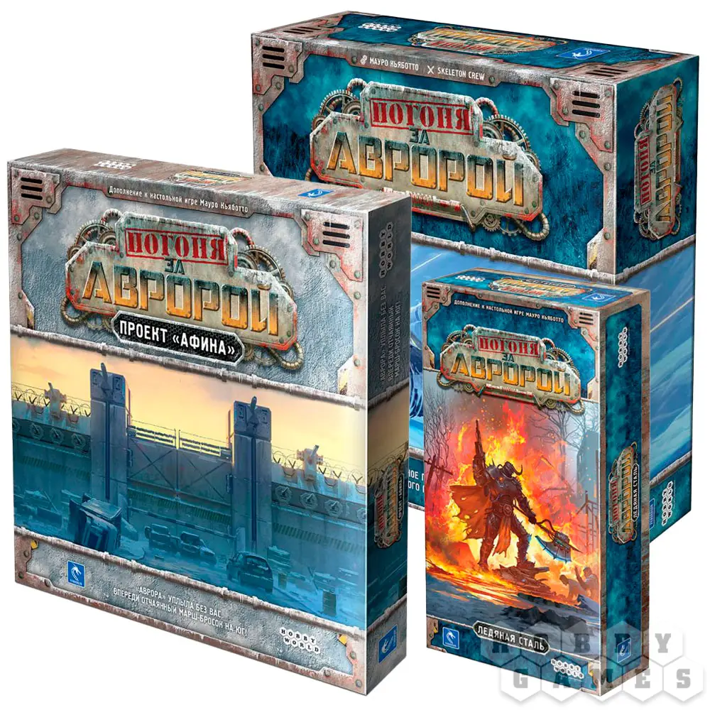 Набор включает в себя игру "Погоня за "Авророй"", дополнение "Погоня за "Авророй": Ледяная сталь" и дополнение "Погоня за "Авророй": Проект "Афина" со скидкой 10%.