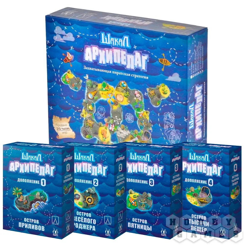 Набор включает в себя игру "Шакал Архипелаг", дополнение "Остров пятницы", дополнение "Остров Весёлого Роджера", дополнение "Остров приливов" и дополнение "Остров тысячи пещер" со скидкой 10%.