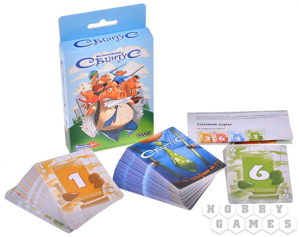 Настольная игра "Свинтус" – это весёлая и быстрая карточная игра для любой компании от 2 до 10 человек. Игра подойдёт детям, но в неё интересно играть и взрослым. В неё можно играть дома, в кафе или в дороге – "Свинтус" прекрасно скрасит ваш досуг. Простые правила, яркий и милый дизайн, динамичный игровой процесс – эти особенности превратили "Свинтуса" в настоящий хит! Хотя сама игра и полностью карточная, тем не менее в ней вам пригодятся даже такие навыки, как хорошая реакция, рефлексы, внимательность и память. Ну и, конечно, компания товарищей, готовых как следует поразвлечься!