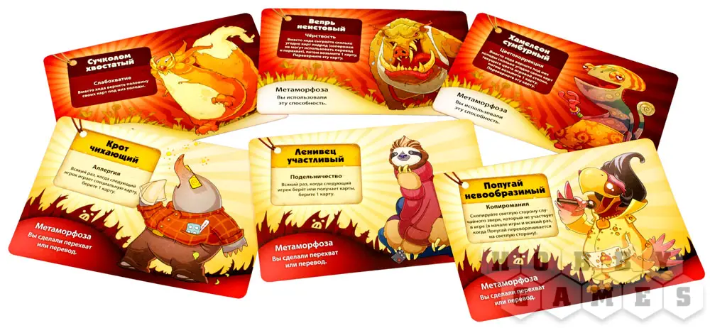 "Метаморфозы" – это расширение для прекрасной карточной игры и всероссийского хита "Свинтус". Дополнение предлагает абсолютно новую механику-надстройку и добавляет пятнадцать зверских ролей. Каждый игрок, облачаясь в шкуру одного из них, получает суперспособности, так что игровой процесс становится ещё более весёлым и непредсказуемым! Более того, вам понадобится всё ваше хладнокровие и внимательность, ведь в любой момент зверь может превратиться во что-то совершенно новое, но страшно интересное!