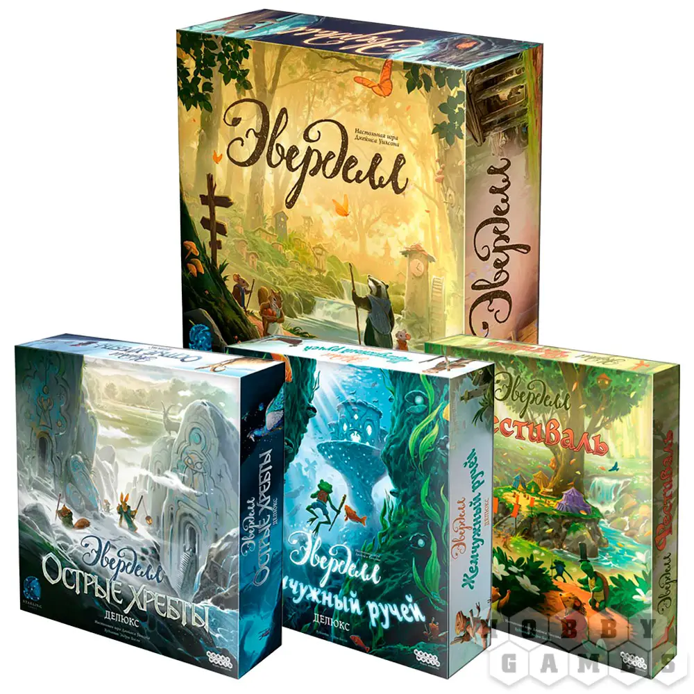 Набор включает в себя игру "Эверделл", дополнение "Эверделл: Жемчужный ручей. Делюкс", дополнение "Эверделл: Фестиваль", и дополнение "Эверделл: Острые хребты. Делюкс" со скидкой 10%.
