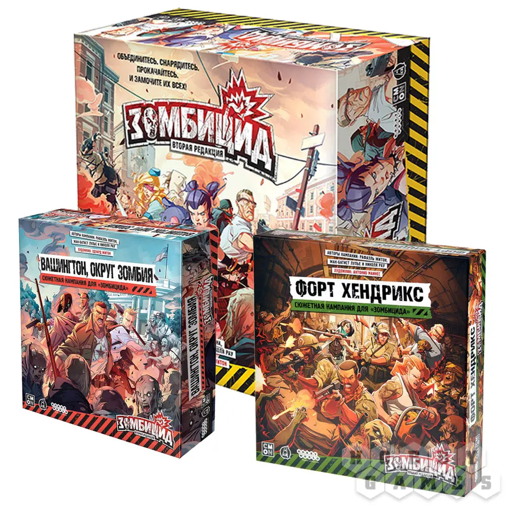 Набор включает в себя игру "Зомбицид. Вторая редакция", дополнение "Зомбицид. Вторая редакция: Вашингтон, округ Зомбия" и дополнение "Зомбицид. Вторая редакция: Форт Хендрикс" со скидкой 10%.
