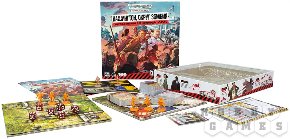 "Вашингтон, округ Зомбия" – это дополнение для настольной игры "Зомбицид. Вторая редакция", которая позволит вам сыграть в эту популярную игру по-новому! Дополнение включает в себя полноценную историю, состоящую из 10 миссий, 6 новых выживших и двух спутников, один из которых – сам президент! Кампания играется по новым, расширенным правилам, которые позволят вам сохранять вещи выживших между миссиями, а также получать достижения и приобретать новые навыки. Если повезёт, сможете разыскать первоклассную экипировку Секретной службы, которая не слабо вас прокачает! Но даже в этом случае расслабляться не стоит: особый жетон часов и ночные правила позволят выжившим рубить зомби в труху всю ночь! Но будет ли это так просто?