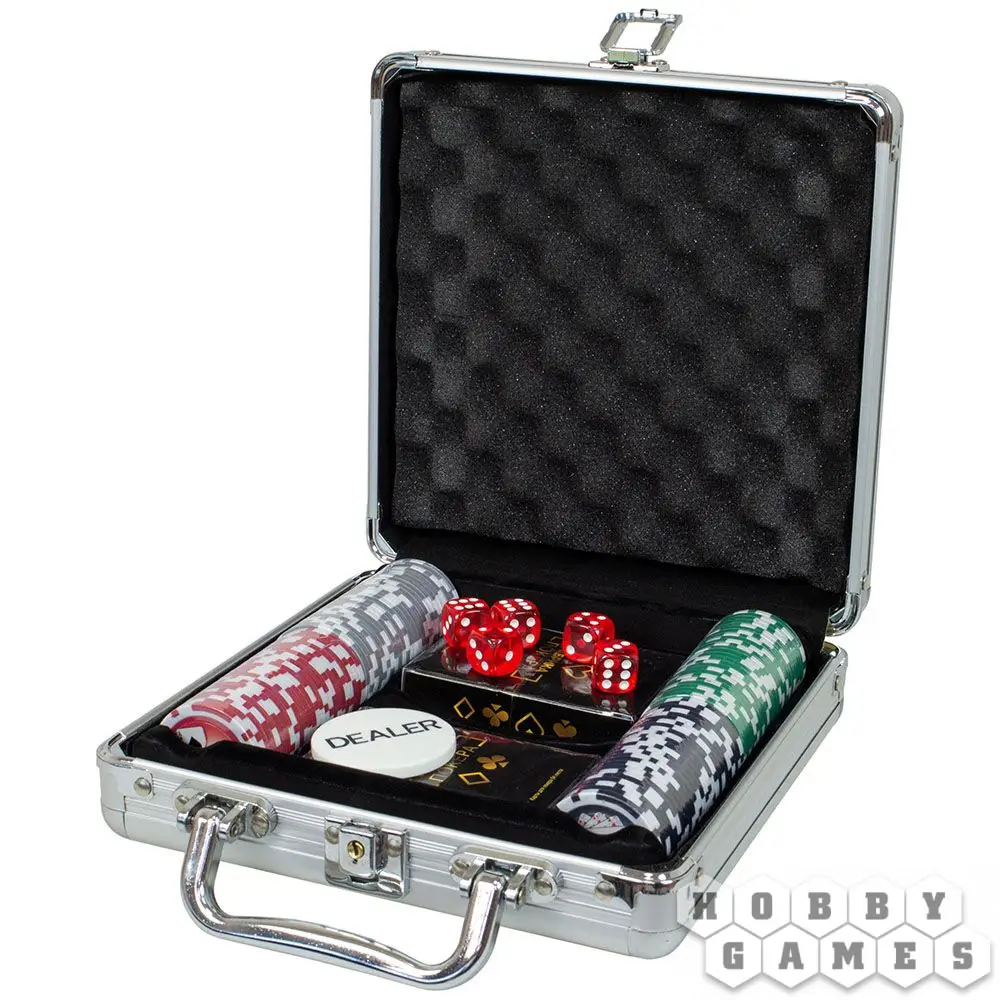 В данном комплекте вы найдёте всё необходимое для игры в классический покер. Внутри вы найдёте 100 стандартных фишек для профессиональной игры (11,5 гр.), фишку дилера, 2 колоды игральных карт, соответствующих качеству карт казино, а также 5 игральных костей. Все компоненты убраны в элегантный и прочный алюминиевый кейс.