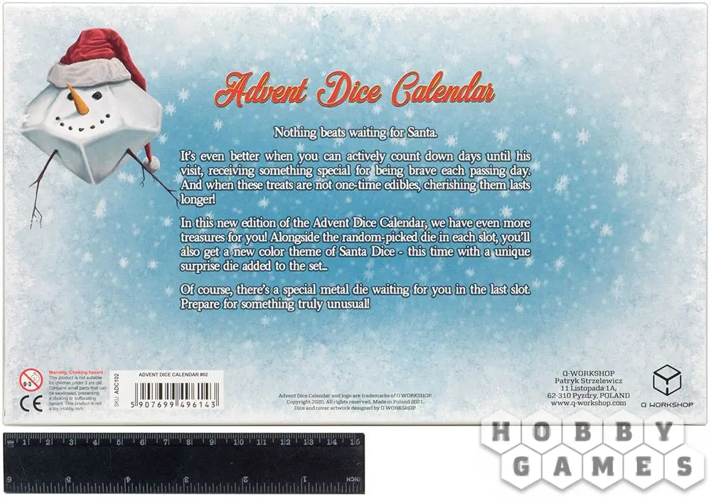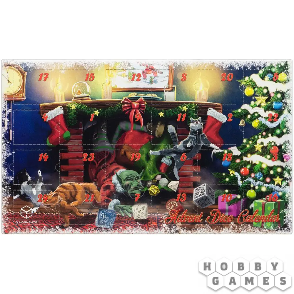 Рождественский набор кубиков Advent Dice Calendar #2 от компании Q-Workshop – это 24 случайным образом выбранных игровых кубика из числа выпущенных в этом году. В наборе могут попасться кубики из коллекций Dice Macabre, Starfinder, My Very First Set и других. Каждый кубик будет лежать в отдельной ячейке. В наборе гарантированно будет полный набор кубиков Santa's Dice Set в новом цвете и уникальная четырёхгранная кость со скруглёнными углами, а в последней ячейке – металлический кубик. Хо-хо-хо, с Рождеством!