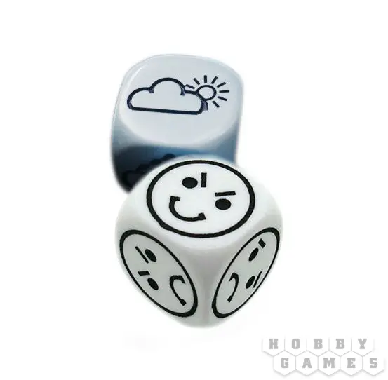 На гранях кубика "Погода" изображены символы погоды: ясно, снег, дождь, гроза и т.д.