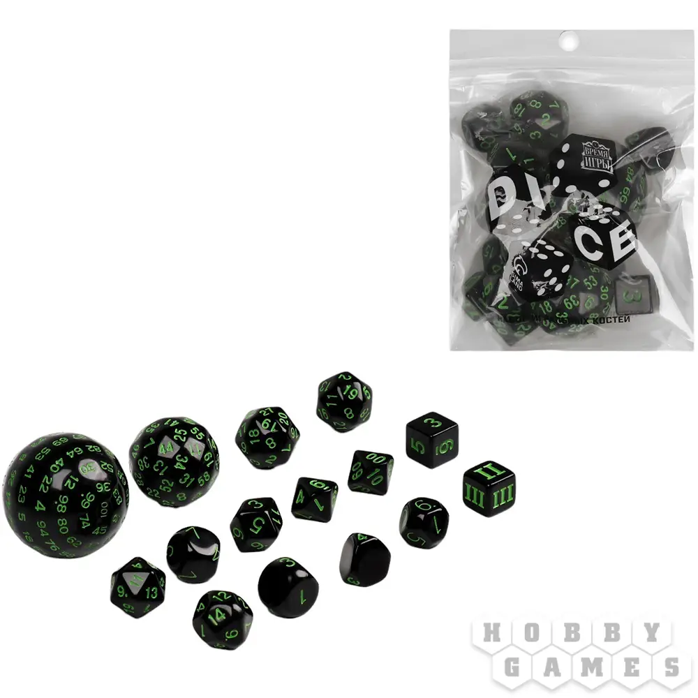 Набор включает в себя 15 кубиков, каждый из которых имеет свой уникальный дизайн, вес и размер: D3, D4, D5, D6, D7, D%, D8, D10, D12, D16, D20, D24, D30, D60 и D100.