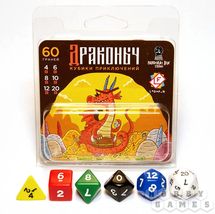 "Драконыч" - набор из 6 кубиков приключений в цветах. Каждая форма в наборе имеет определенный цвет, что позволяет легко выбирать необходимые для броска кубики. Это актуально при прохождении различных проверок при игре в Pathfinder и может сэкономить время хода, один из главных ресурсов любой игровой партии.
