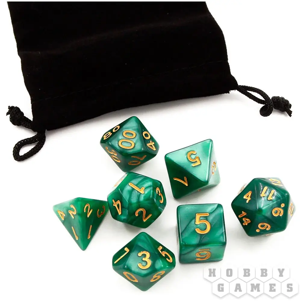 Наборы кубиков для ролевых игр решают проблему покупки необходимых дайсов. В наборе содержатся семь кубиков: D4, D6, D8, D10, D10%, D12 и D20. Поставляются кубики в комплекте с бархатным мешочком для хранения, который также удобно брать с собой на игру, ведь он легко помещается в карман.