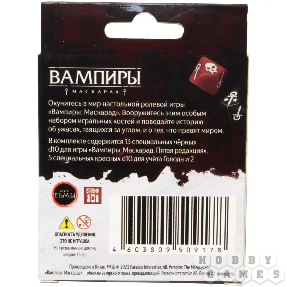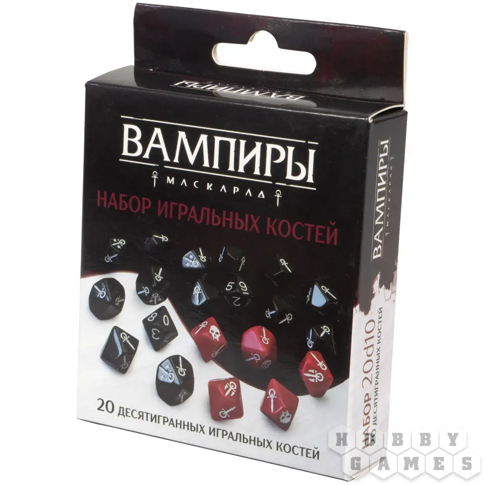 Этот набор кубиков, предназначенный для игры "Вампиры: Маскарад. Пятая редакция", позволит игрокам непринуждённо и легко влиться в атмосферу кошмара и ужаса, которым полнится мир игры. В комплекте вы найдёте 2 обычных кубика d10, а также 18 кубиков d10 с оригинальными символами игры от Paradox Interactive, среди которых 13 кубиков чёрного цвета для стандартных проверок навыков и 5 кубиков красного цвета, предназначенных для пула Голода. С ними ваши партии в "Вампиры: Маскарад" станут более аутентичными.