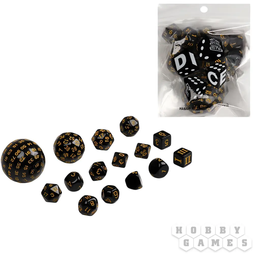 Набор включает в себя 15 кубиков, каждый из которых имеет свой уникальный дизайн, вес и размер: D3, D4, D5, D6, D7, D%, D8, D10, D12, D16, D20, D24, D30, D60 и D100.