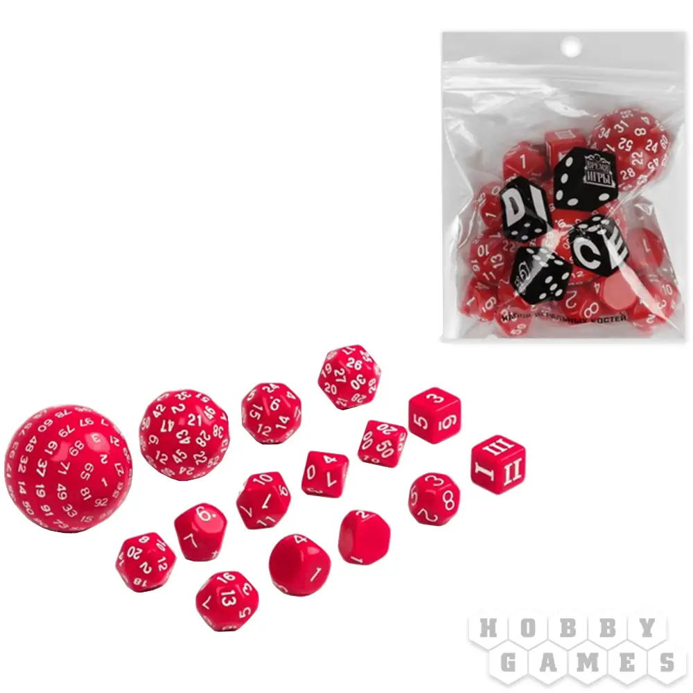 Набор включает в себя 15 кубиков, каждый из которых имеет свой уникальный дизайн, вес и размер: D3, D4, D5, D6, D7, D%, D8, D10, D12, D16, D20, D24, D30, D60 и D100.