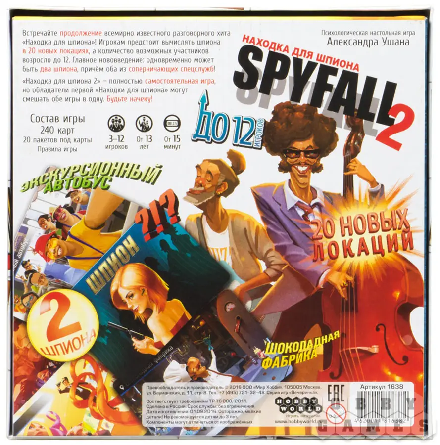 "Находка для шпиона 2" – это самостоятельное продолжение нашумевшего хита. Другими словами, для игры вам не понадобится базовая версия, однако при её наличии, вы сможете объединить их и сильно усложнить жизнь шпиону за счёт огромного разнообразия карт, ведь в новой версии добавляются целых двадцать новых локаций! Более того, теперь вы сможете собрать в игре до двенадцати игроков, а шпионов при этом может быть целых два! Причём как из конкурирующих спецслужб, так и из одной конторы – для этого есть специальные правила.