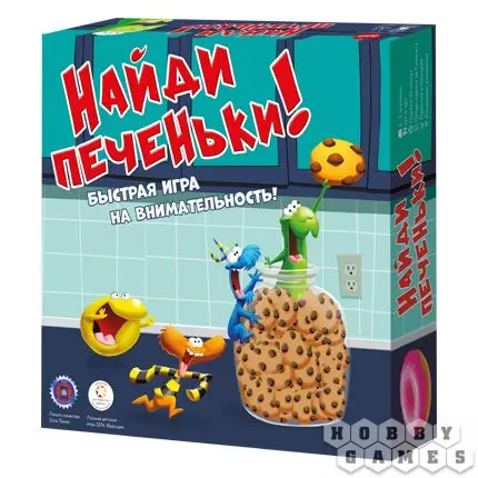 “Найди печеньки!” – быстрая игра на внимательность. В начале каждого хода на столе выкладывается ряд из трёх карт, на которых изображены сладости, между которыми протянут верёвочный лабиринт. Бросок кубика определяет, с изображения какой вкусности необходимо начать игру. Далее нужно по верёвочке отследить путь от первой печеньки первой карты до последней на третьей карте.
