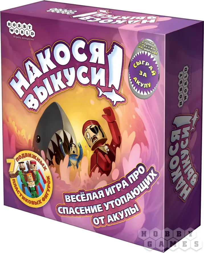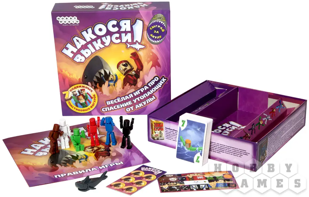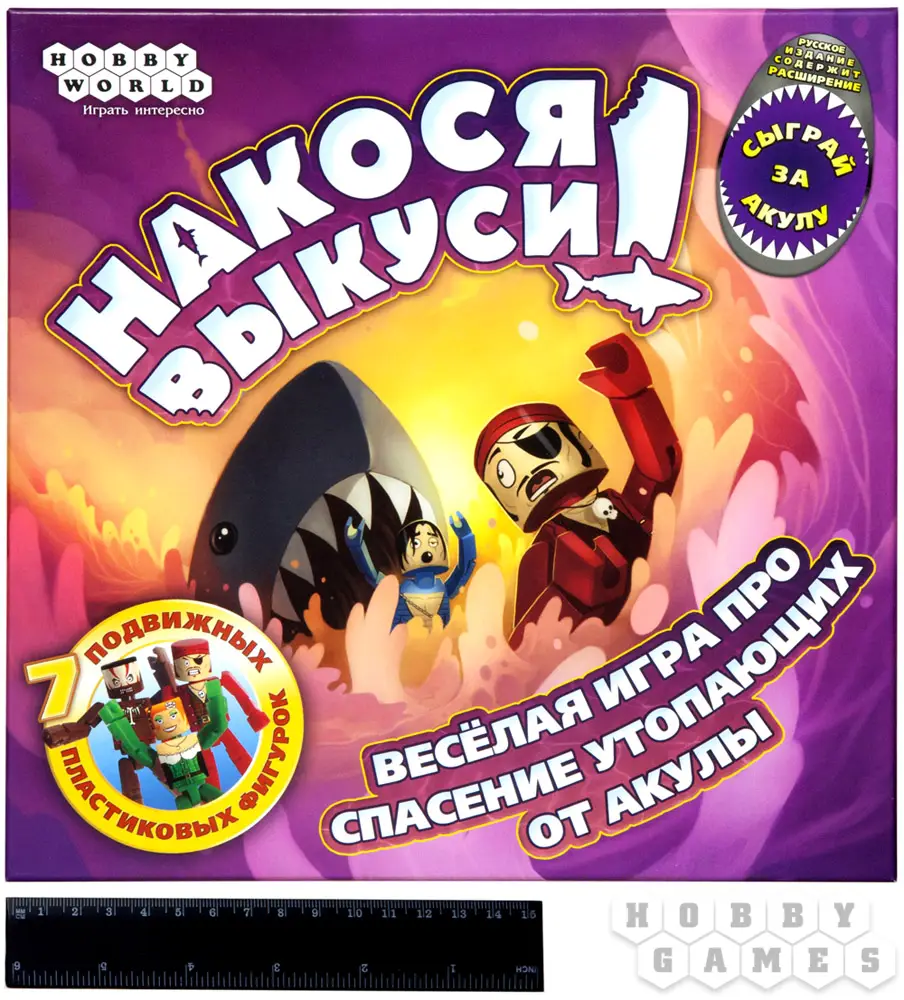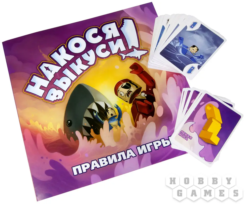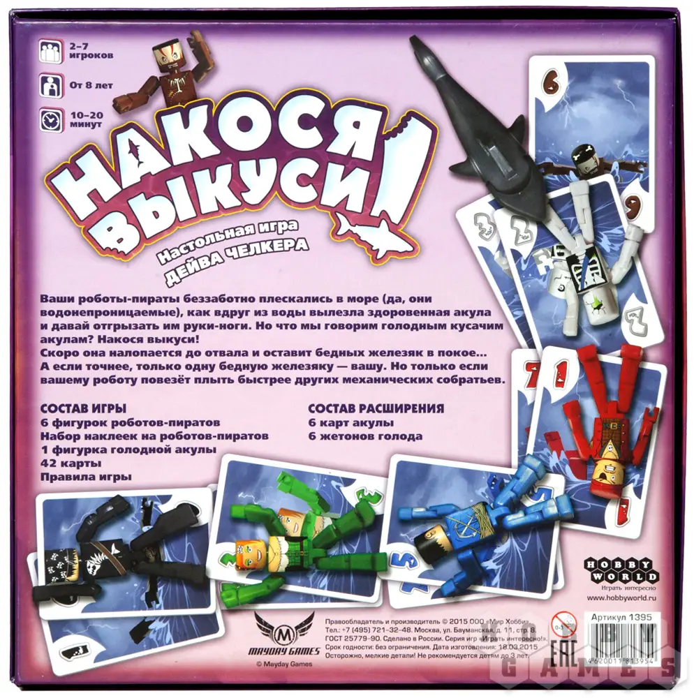 «Накося выкуси» — это быстрая динамичная игра для 2-7 игроков, которая придётся по душе и взрослым и детям. Водный антураж, забавные роботы-пираты и простые правила помогут скоротать время в поездке или разбавить семейный тихий вечер. В коробке вы также найдёте дополнение «Сыграй за акулу», с помощью которого один из игроков может принять сторону зла и стать акулой. Водные просторы ждут вас!