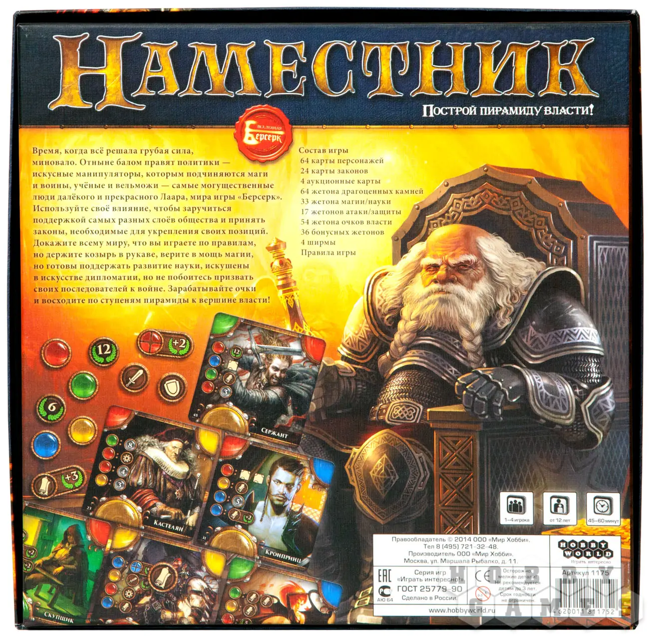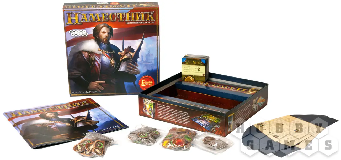 Богатая комплектация игры, яркий и красивый дизайн, глубокие, но не сложные в освоении правила игры, оригинальная механика и даже возможность играть одному — вот чем порадует вас «Наместник»!