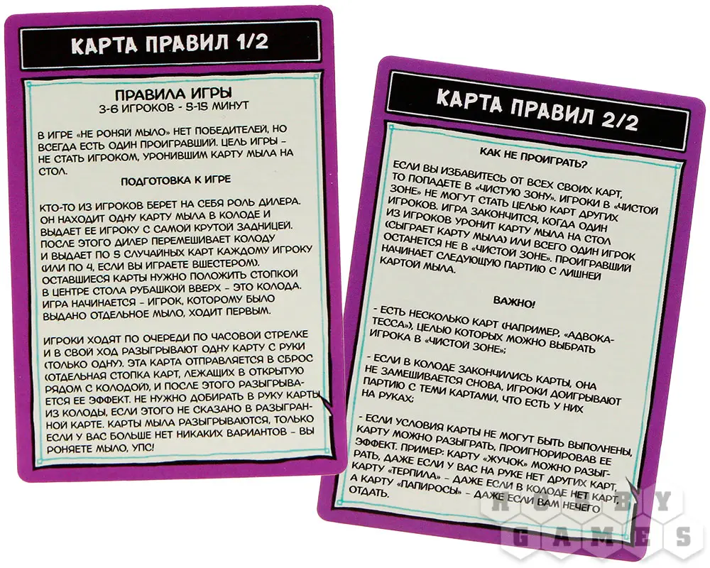Перед вами игра, в которой нет победителей, а только один проигравший. "Не урони мыло" – это юмористическая карточная игра для взрослых, действие которой происходит в тюремном душе, и вот тут уж нужно быть начеку! Игроки играют роль тюремных заключенных, которые всеми возможными способами пытаются обмануть друг друга. Цель игры – не быть тем игроком, который уронил мыло.