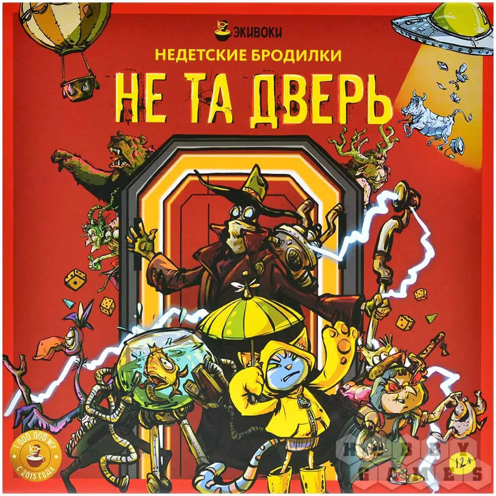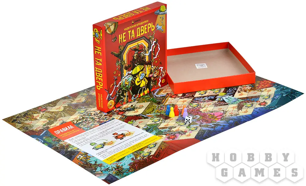 "Не та дверь" – это увлекательная, местами жестокая и опасная игра-бродилка, где за каждым поворотом скрываются неожиданные и пугающие сюрпризы. В ней вы на собственном опыте прочувствуете, что бывает, когда поддаёшься любопытству и заглядываешь туда, куда очень хочется подсмотреть, но не стоит, ведь выбраться из этого заманчивого местечка – задача та ещё и под силу не всем. В одной коробке вас ждут целых 2 игры, представленные двухсторонним полем. С одной стороны – "Лаборатория", таящая в себе последствия удачных и неудачных научных экспериментов (постарайтесь не стать ещё одним!). С другой – "Гиблое место"; как следует из названия, захолустье то ещё, со всеми вытекающими опасностями. Ваша задача проста – кидать кубик, передвигать свои фишки и попытаться добраться до финиша. Вот только главным препятствием станут ваши же друзья – ведь каждому из вас придётся противостоять соблазну столкнуть соперника в плохой портал, сбить с верного пути или указать неверное направление. Впрочем, можно ведь и отдаться этим соблазнам: вам же лучше... Что бы вы ни выбрали, будет весело – и весьма коварно!