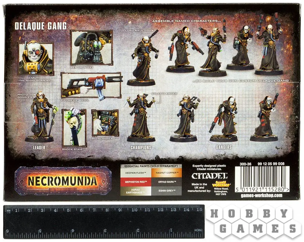 В наборе Вы найдёте 10 сборных пластиковых моделей Делаков и десять 25 миллиметровых подставок для Некромунды. Правила для использования банды Вы найдёте в книге "Некромунда: Банды подулья" или же в декабрьском номере журнала "White Dwarf" от 2018 года.