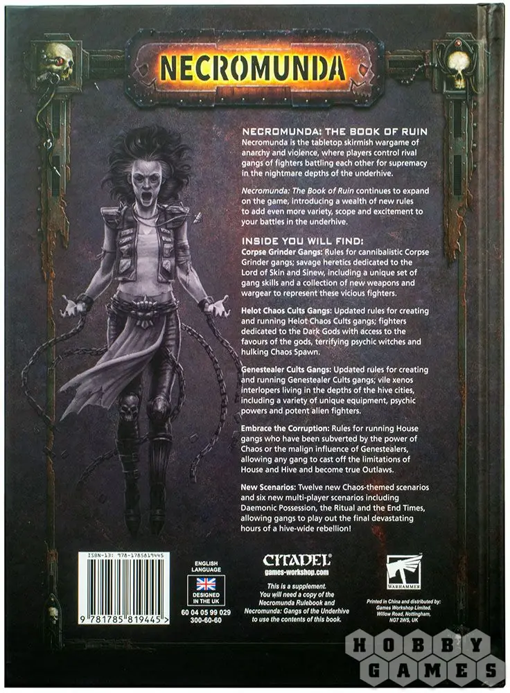 Окунитесь в самые закрытые и укромные уголки Подулья, туда, где в темноте разрастается восстание. Узнайте больше о Культах Измельчителей Трупов (Corpse Grinder Cults), Рабских Культах Хаоса (Helot Chaos Cults) и Культах Генокрадов (Genestealer Cults), а также их планах вырвать контроль над ульем из рук Лорда Хелмавра. Откройте для своей банды новых наёмников, которые помогут осуществить задуманное. Книга Necromunda: The Book of Ruin также включает в себя шесть различных кампаний по проведению мятежа и большой набор инструментов арбитров, а также различные пути для улучшения ваших миссий и кампаний.