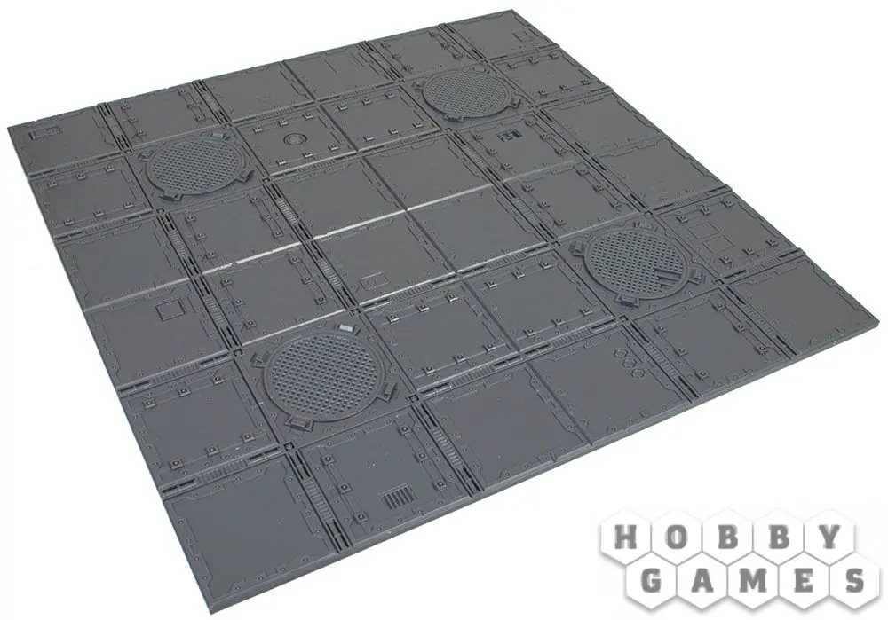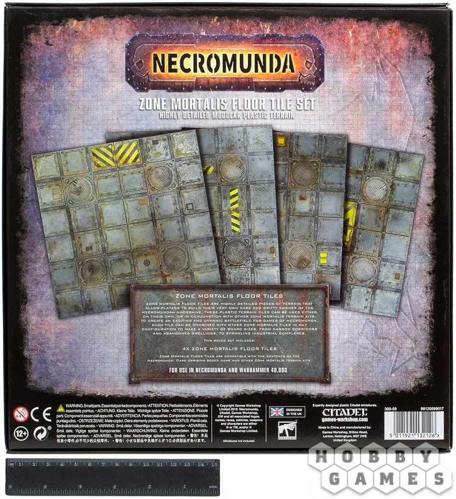 Данный набор содержит четыре пластиковых 12-дюймовых плиты, которые представляют собой пол Зоны Морталис. Эти квадратные тайлы полностью совместимы с элементами ландшафта из стартового набора Necromunda: Dark Uprising и другими комплектами из серии Зоны Морталис.