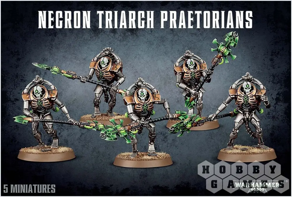 Модели Triarch Praetorians высокодетализированы и подробно отображают династические символы во всей красе на их древних доспехах и тяжёлых щитах. К классическому скелетно-металлическому каркасу добавились сегментированные металлические набедренные повязки. Юниты вооружены громоздким древнем оружием, например, боевыми косами с тяжёлым лезвием, но некоторые всё же предпочитают гиперфазовые мечи и дисперсионные щиты.