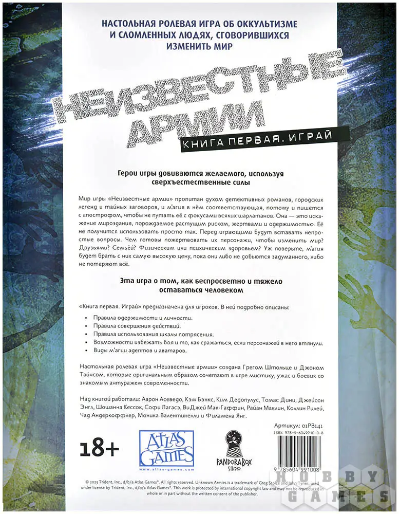Под обложкой "Книги 1: Играй" вы найдёте всё, что вам надо знать об устройстве системы и мире НРИ "Неизвестные Армии". Она будет полезна не только в качестве книги игрока, но и для ведущего игры, поскольку содержит в себе все основные правила.