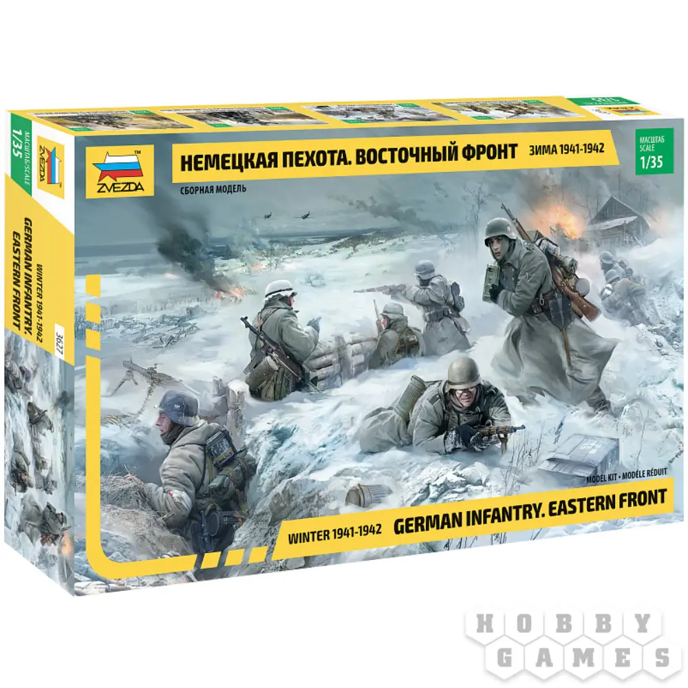 Немецкая пехота Восточного фронта, зима 1941-1942 гг., представляет собой набор фигурок, воссоздающих солдат вермахта в период решающих боёв под Москвой. Зима 1941 года стала жёстким сдерживающим фактором для немецкой армии. После попытки наступления на Москву в 1941 году, их продвижение застопорилось, и зимние условия лишь усугубили положение. Жёсткие морозы, недостаток снабжения и упорное сопротивление советских войск привели к неминуемому поражению немцев на подступах к столице. Это событие можно считать переломным моментом, изменившим последующий ход войны.
