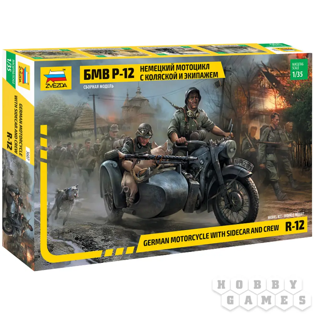 Этот набор позволит вам собрать детализированную модель немецкого мотоцикла BMW R-12. Он был одним из самых массовых в немецкой армии благодаря своей надёжности и доступной цене. Более 36 000 единиц были построены для военных и гражданских нужд. Он применялся для транспортировки оружия и боеприпасов, перевозки раненых, разведки и многих других задач. В боевых подразделениях на коляску мотоцикла устанавливался пулемёт.