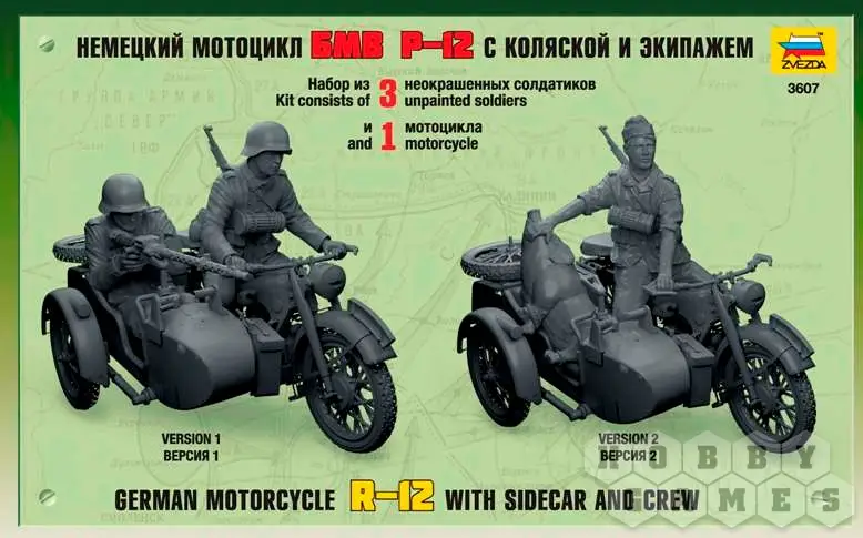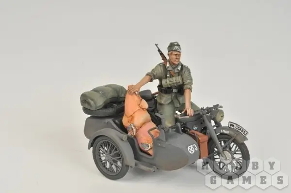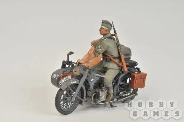 Набор включает 3 фигурки солдат и миниатюру BMW R-12, что позволяет воссоздать различные военные действия.