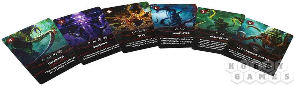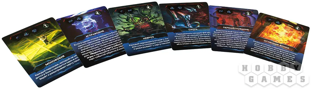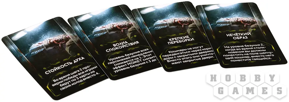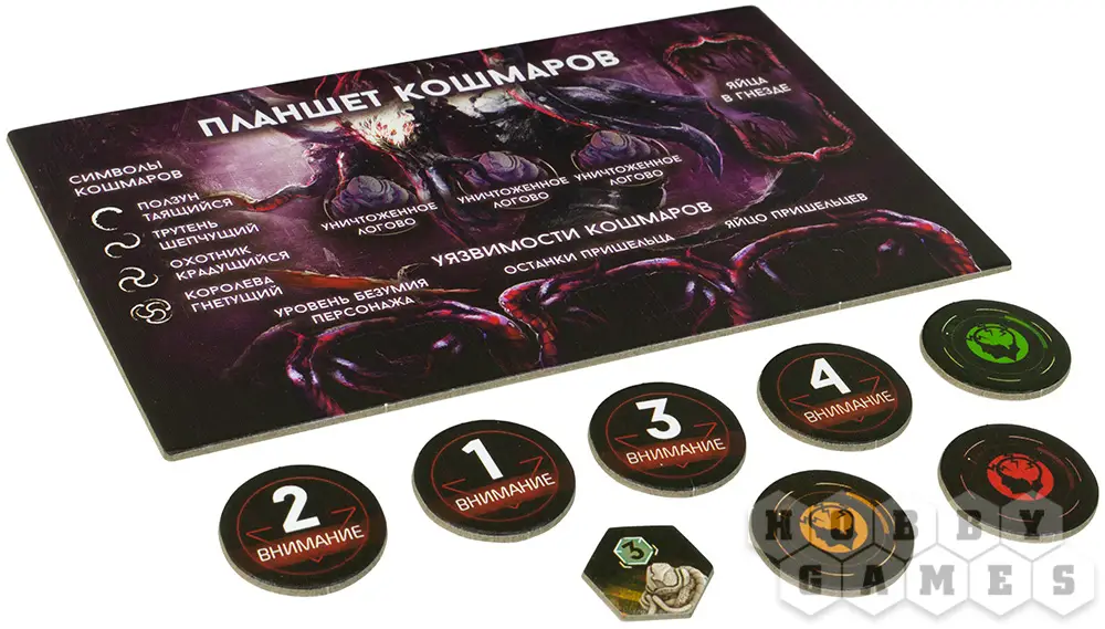 В дополнении "Кошмары" вы найдёте высокодетализированные миниатюры пришельцев, планшет кошмаров и специальные карты событий. Также ваши персонажи в определённый момент могут сойти с ума, впадая в безумие. После этого каждый раз, когда нужно будет разыграть столкновение, тип появляющегося кошмара определится уровнем безумия персонажа. Если уровень безумия станет слишком высоким, персонаж погибнет.
